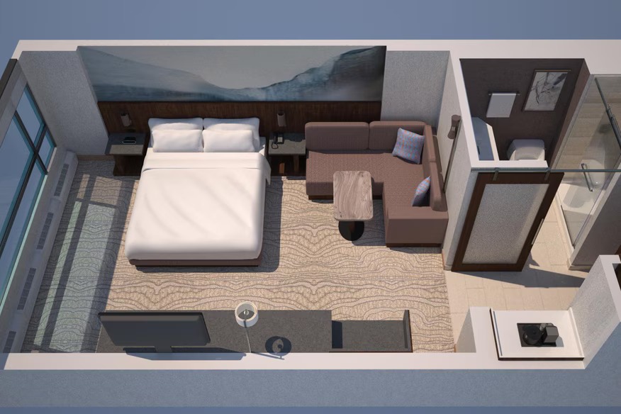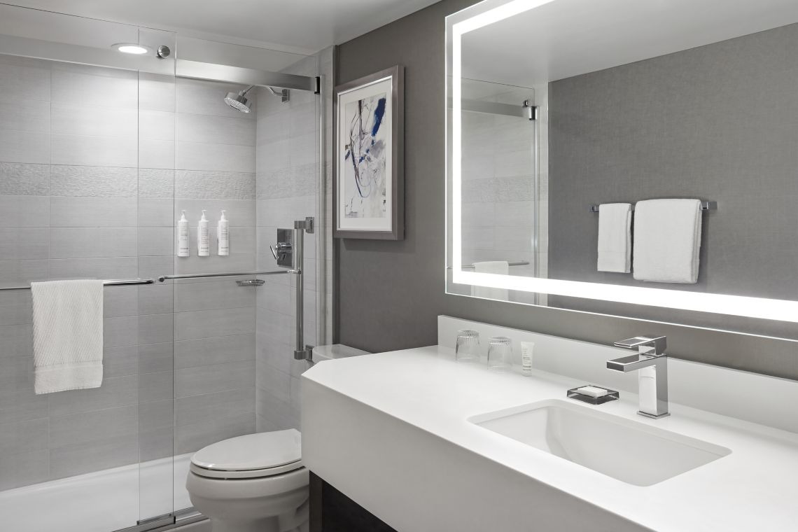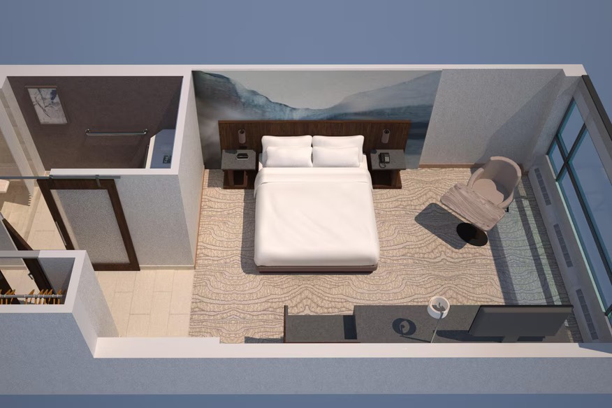 Enjoy a spacious and contemporary room featuring one king-size bed with plush bedding. Designed for comfort and productivity, the room includes a large work desk, mini-fridge, flat-screen TV, and modern bathroom with premium bath amenities. Select rooms offer stunning views of Calgary’s skyline. Ideal for business or leisure travelers seeking privacy and modern conveniences.