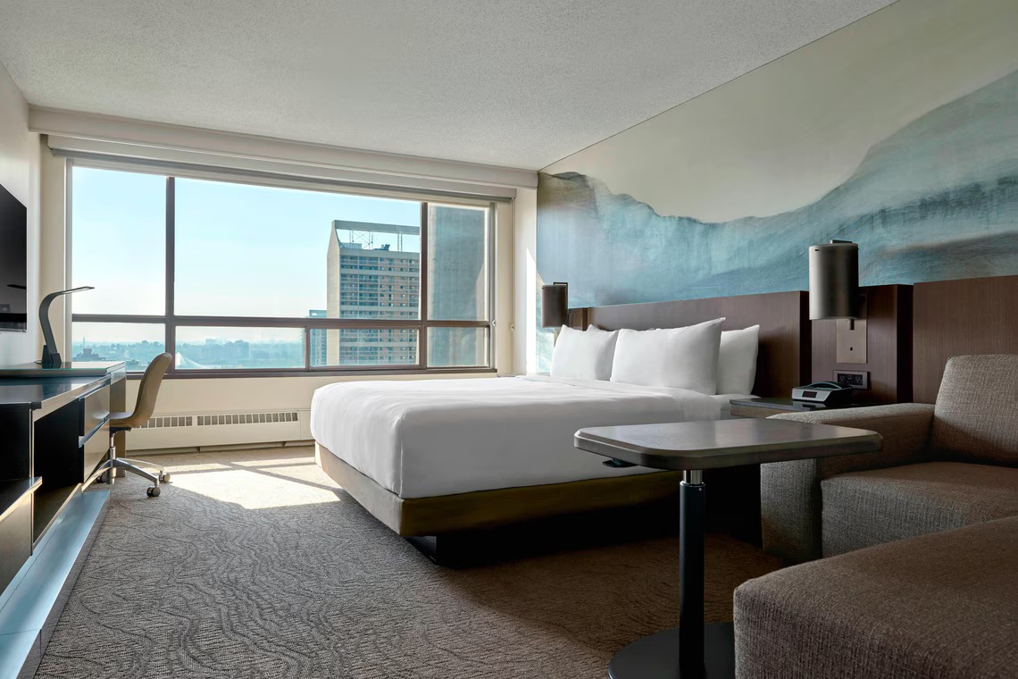 Located in the heart of downtown and directly attached to the convention centre via the +15 skywalk, Calgary Marriott Downtown Hotel delivers contemporary comfort and premium amenities for business and leisure travellers alike. Newly renovated rooms feature floor-to-ceiling windows, plush bedding, ergonomic workspaces, and modern bathrooms. Hotel highlights include the M Club Lounge for concierge floor guests, a 24-hour fitness center, multiple dining options (including ONE18 EMPIRE), and a Starbucks on site. Delegates benefit from the hotel’s direct convention access, vibrant atmosphere, and attentive hospitality